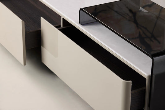 Kian Beige And Black TV Unit With Extendable Glass Top
